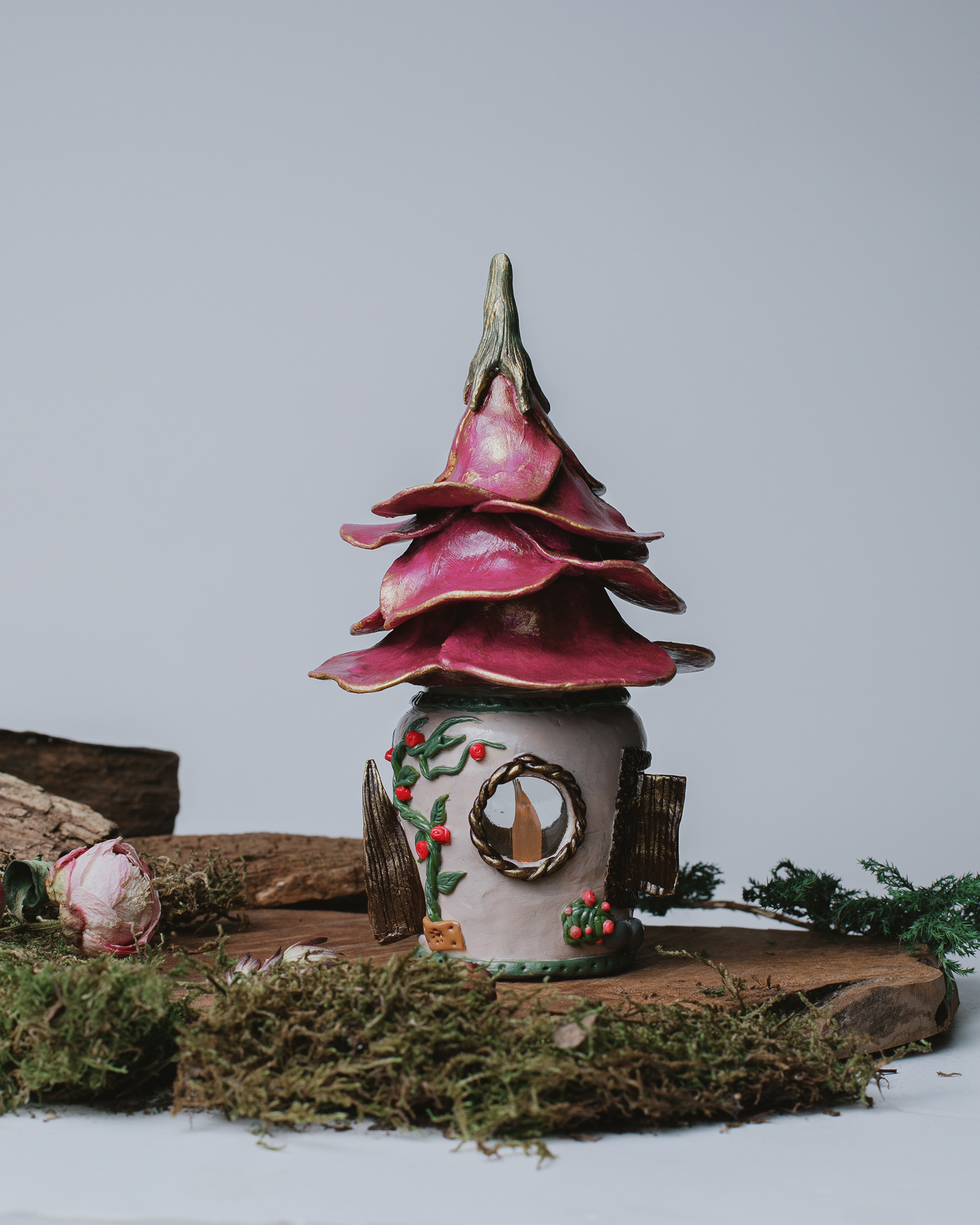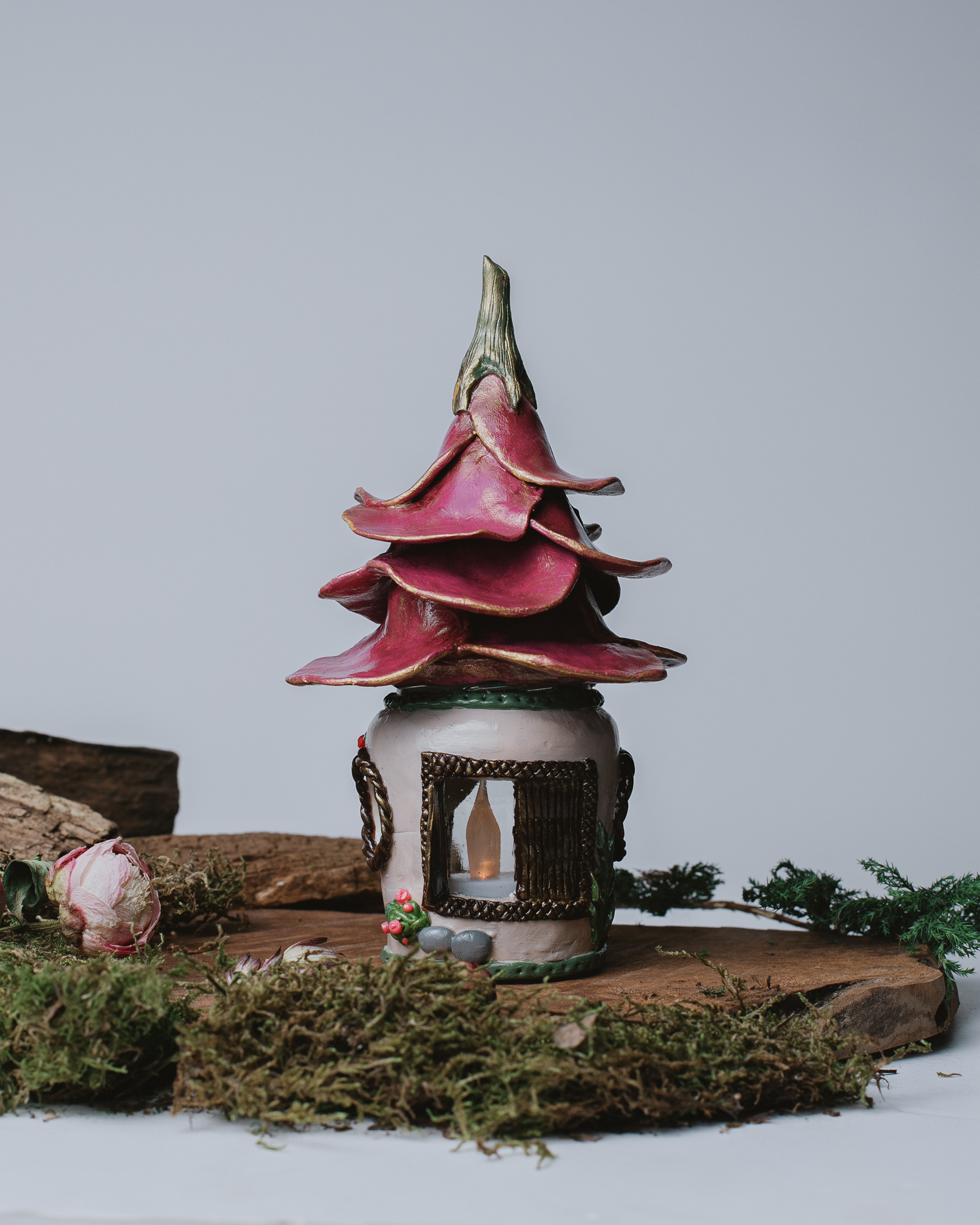 To create them, I use any glass jar, clay or polymer clay, acrylic paints and LED lights or LED candles. The first step would be to wrap the glass jar with clay and give it the shape I want, then I let it dry. Once dry, I paint the fairy house with acrylic paints.